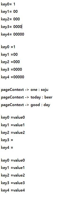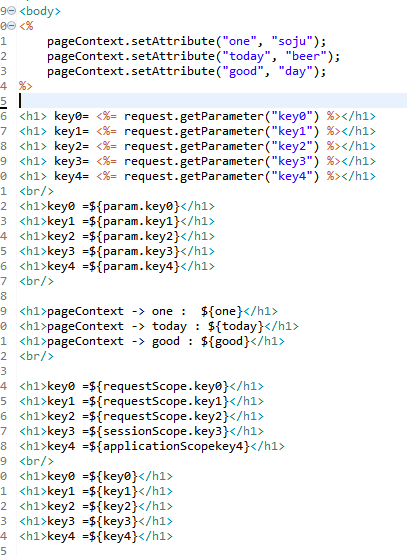 >> pageContext의 경우는 JSP 페이지에서 <% pageContext.setAttribute("key","value") %> 를 통해서 값을 저장하고, ${}를 통해서 사용 할 수 있음을 확인 하였습니다.
