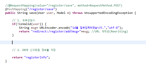/register/save 요청을 받고 해당 save메서드가 실행되는데