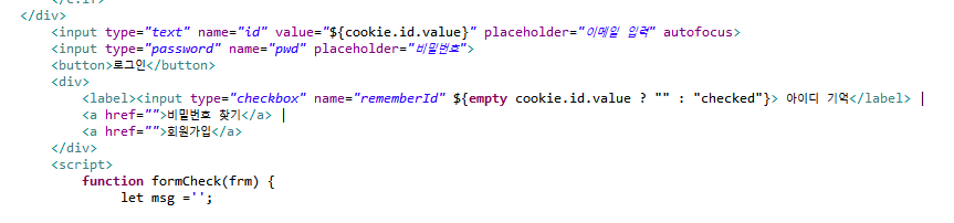 로그인이 출력되어야 하므로 ${cookie.id.value} // 쿠키가 존재한다면 체크되어야 하므로