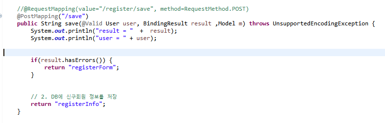 그러면 해당 URL 요청이 발생하면 자동으로 User 객체에 대한 검증이 실시되고 해당 결과는 result로 들어가게 되어