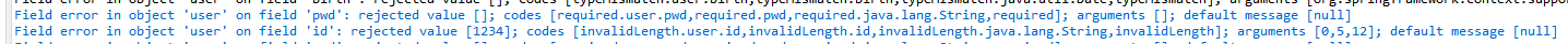 >> 에러내용을 확인하기 위해서는 <form:errors path="id"> 를 사용한다 이때 path는 의 값은 필드값을 나타낸다 id 필드
