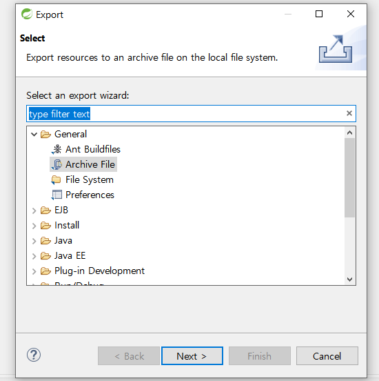 1> Export > General > Archive File > To archive File 경로 설정 후 finish'
