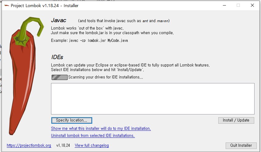 >> Specify location 을 눌러서 해당 lombok을 적용시킬 프레임워크를 추가한 후에 install/update를 눌러주면 끝난다.