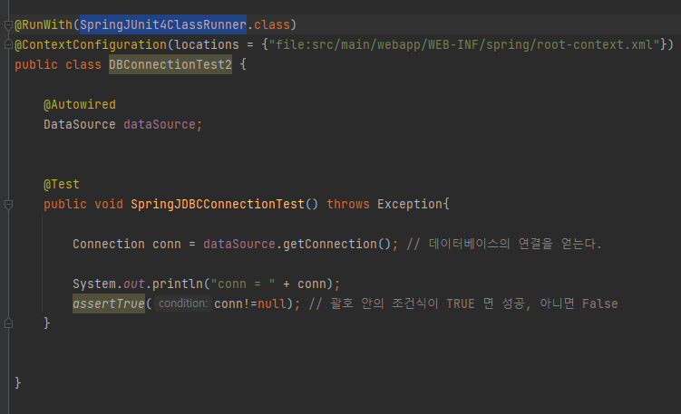 >> @RunWith를 통해서 ApplicationContext 가 생성되고, ContextConfiguration을 통해서 Root-context 설정이 추가되어 진다.