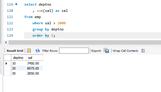 >> GROUP BY 절을 기술하지 않거나 GROUP BY 절에 NULL 이나 ()을 기술하면 전체 행이 하나의 행그룹으로 처리된다.