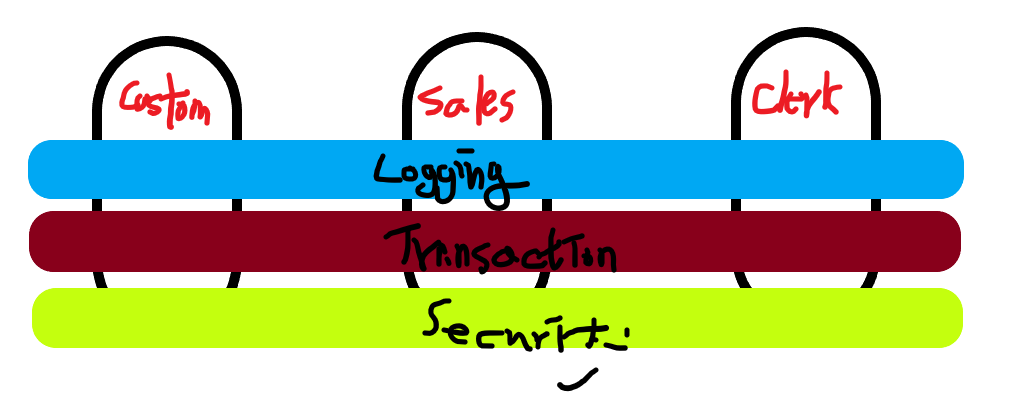 >> Custom, Sales, Clert 라는 메서드에 Logging, Transaction, Security 가 모두 들어간다 고했을때 이 기능들을 분리하여 공용으로 사용할수 있도록한다. 그리고 해당 메서드에 자동으로 주입해준다.