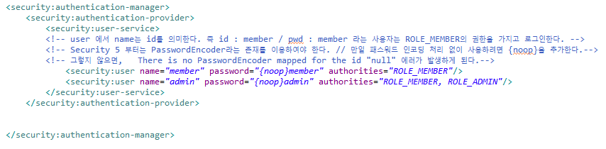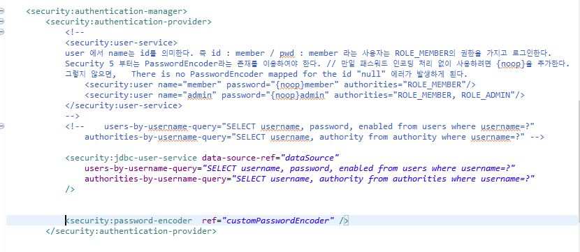 이전의 예제에서 security-context.xml에 문자열을 고정한 방식은 InMemoryUserDetailsmanager를 이용한 방식이다.