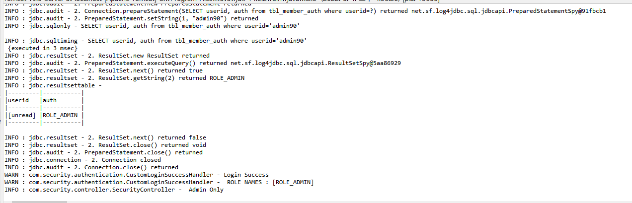 JSP-> 설정한 /customLogin -> suers-by-username-query, authorities-by-username-query 를 통해서 인증을 받은 후