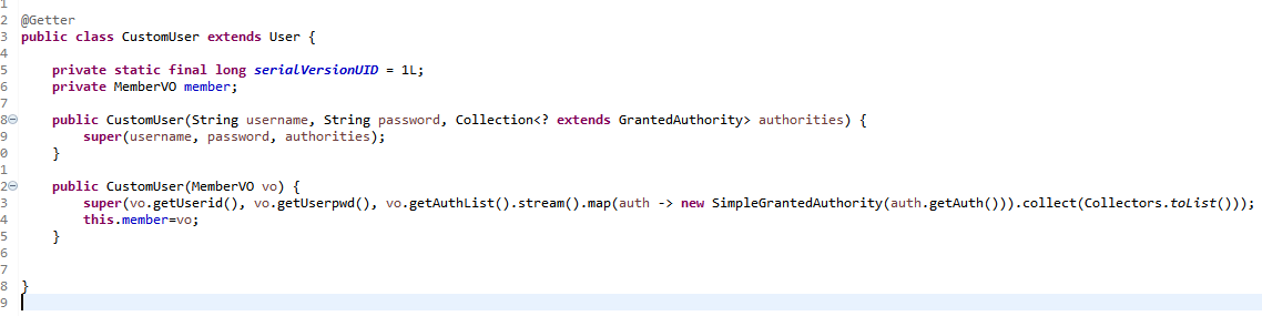 super() 를 통해서 CustomUser생성자에 MemberVO를 주입하면 User의 생성자에 자동으로 주입이 된다.