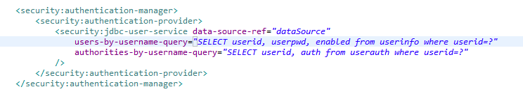user-by-username-query 와 authorities-by-username-query 를 통해 Basic Query를 수정하여 사용할 수 있다.