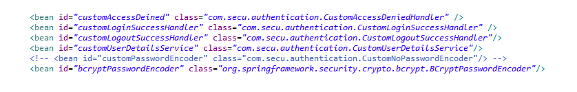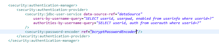 - 이경우의 경우 security-context.xml 에서 아래와 같이 BEAN 등록을 한후에 password-encoder로 설정해주면된다.