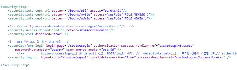 - <security:access-denied-handler ref=""> : 권한이 없는 아이디로 접근을 시도할 경우 처리하는 동작을 나타내는 클래스 이다. 옵션으로 error-page="" 의 경우 해당 URL로 이동하고 ref=""의 경우 추가적인 작업이 필요한 것으로 Class를 생성한 후 AccessDeniedHandler를 상속하여 처리하도록 한다.
