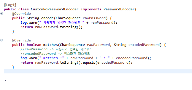 - 이방법의 경우 Class를 생성 한 후 PasswordEncoder 를 상속하여 encode()와 matches()를 오버라이딩 하여 사용하면되는데 암호화 없이 바로 로그인 되도록 설정해 보도록 하겠다.