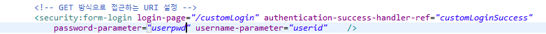 - <security:form-login login-page="" authentication-success-handler-ref="" password-parameter="" 등..>