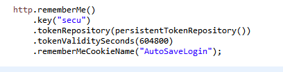 - remember-me-cookie : 브라우저에 보관되는 쿠키의 이름을 지정합니다 default 값은 'remember-me' 입니다.