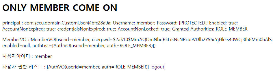 | isAnonmous() - <sec:authorize acess="isAnonmous()"> | 익명의 사용자의 경우(로그인을 하지 않은 경우도 해당) True |