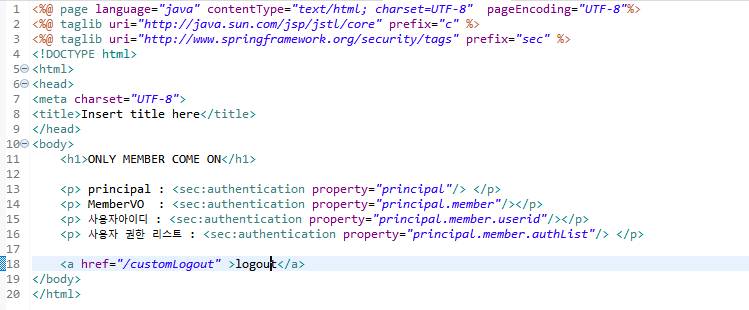JSP 에서 스프링 시큐리티와 관련된 정보를 출력하거나 사용하려면 JSP 상단에 스프링-시큐리티 관련 태그 라이브러리를 선언하고, <sec:authentication> 태그와 principal 이라는 이름의 속성을 사용합니다.