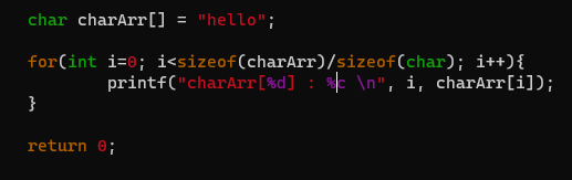또한 해당 문자열을 나타낼 떄는 %c를 통해소 char문자 한개 한개 요소를 나타낸다
