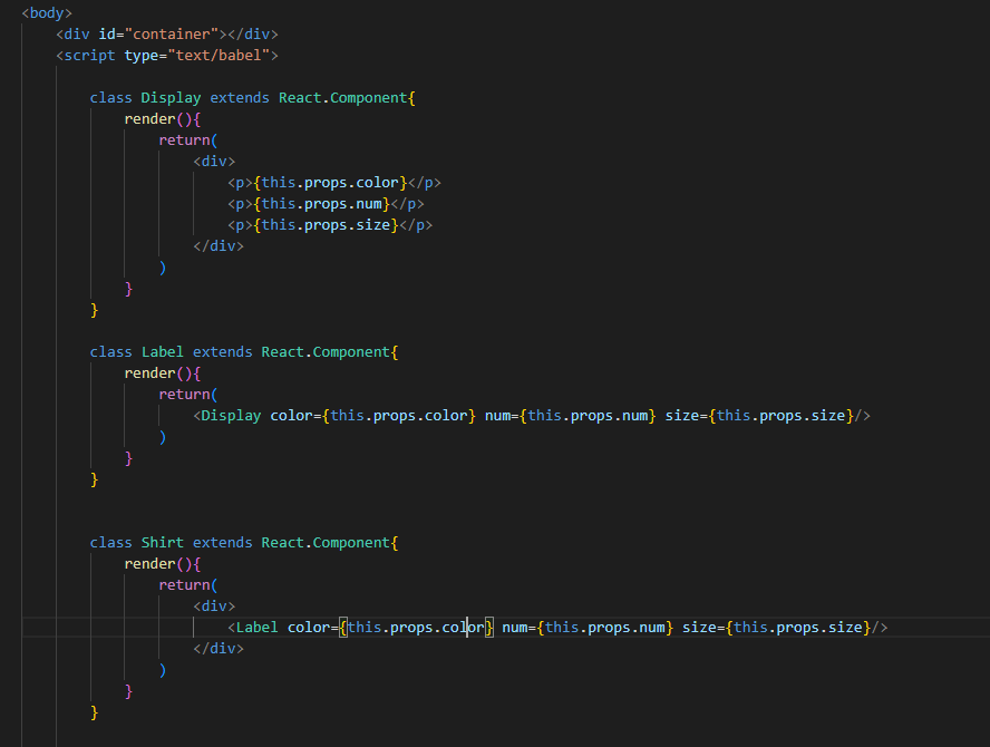 ReactDOM.render() 에서 정의된 값이 각 컴포넌트들에게 전달되어 마지막에 있는 곳에서 Display 컴포넌트에서 값을 표시하였다. 즉 목적지를 향하는 경로에 있는 모든 컴포넌트들이 각 속성에 접근하고 재정의해 전달하는 것이다.