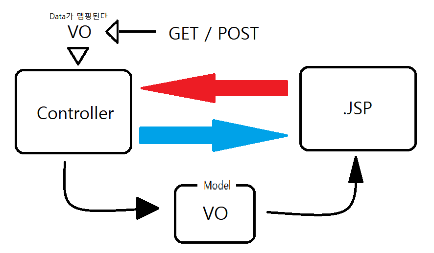 Controller로 보내 해당 메서드를 실행시킨다. 이때 매개변수에 VO가 선언되어 있을경우 보낸 데이터와