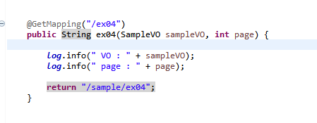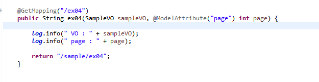 /sample/ex04 에서는 Page값이 나타나지 않는다. 이때 강제로 페이지 화면까지 넘어갈수 있도록 쓰는게 @ModelAttribute 어노테이션이다.