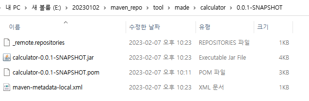 해당 groupId, artifactId를 통해 directory를 만들고 해당 폴더 안에 jar파일과, pom 파일을 생성하여 준다.