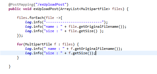 여러개의 파일인 경우 Collection을 통해서 여러개의 파일을 받는다. foreach() 메서드를통해서 파일 한개씩 for문을 돌릴수있다.