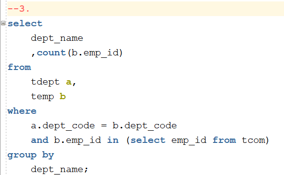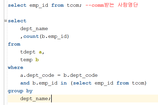 //TCOM에 COMM을 받는 사번이 있고, SUB QUERY 를 사용하여 부서별로 COMM을 받는 인원수를 세는 문장을 만들자.