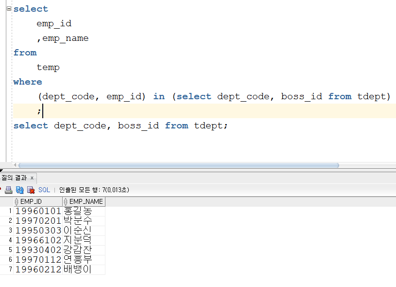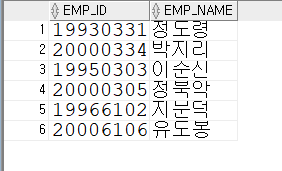 주니 tcom 에서 선택된 8개의 사원번호가 출력되었다.