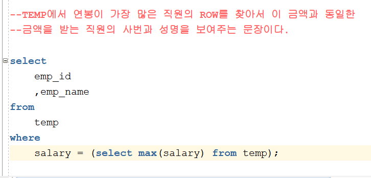 SUB QUERY가 조건의 비교문으로 사용될때 연산자가 IN,ANY,ALL,EXISTS이 아닌경우 SUB QUERY에서 나오는 결과 행의 수가 1보다 클 수 없다.이렇게 서브 쿼리의 결과가 항상 한 행 보다 클수 없는 경우를 SINGLE ROW 서브쿼리 라고 한다.
