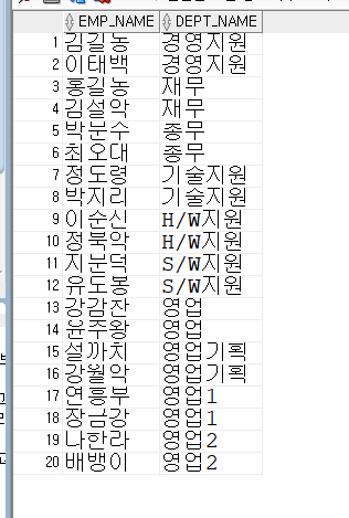 순서대로 한번 값을 찾아가보자1.우선, EQUAL JOIN을 통해서 사원명과 부서명을 출력해 보았다. 그결과 두테이블 공통으로 가지고 있는값들이 출력되었는데 사원이 총 20명이므로 부서도 20개 모두 출력되었다.