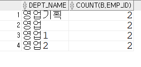 전에 나온 8개의 데이터를 그룹별로 묶어서영업 2, 영업기획 2, 영업1 2, 영업2 2 값이 return 되었다.