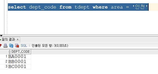 위에서 보다시피 SUB_QUERY의 결과는 'BA0001','BB0001','BC0001' 3개가 나왔다. 이렇게 하나이상의 행이 SUB QUERY의 결과로 나올 가능서이 있는 경우를 MULTI ROW 서브쿼리라고 부른다.