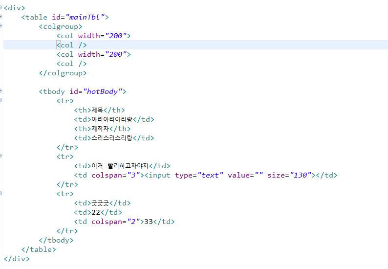 <col> 행을 4행으로 지정해줬고, colspan 을통해 2,3,4,행을 한셀로 사용할수 있도록 묶은것도 보인다.