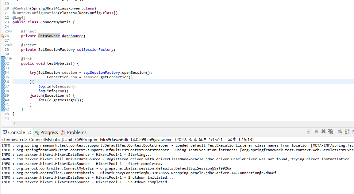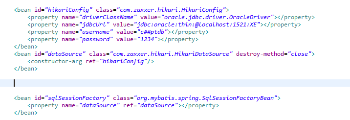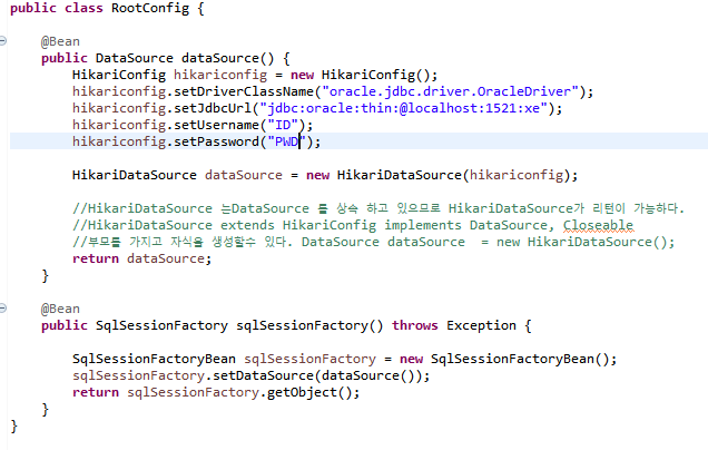 이렇게 생성된 HikariConfig 객체를 HikariDataSource객체에 생성자 매서드로 추가해준 모습입니다.
