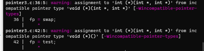 int (*fp)(int * a, int * b); 로 함수형 포인터의 반환형을 int로 바꾸고 컴파일 하니 Warning이 뜨는것을 확인 할 수 있었다.,