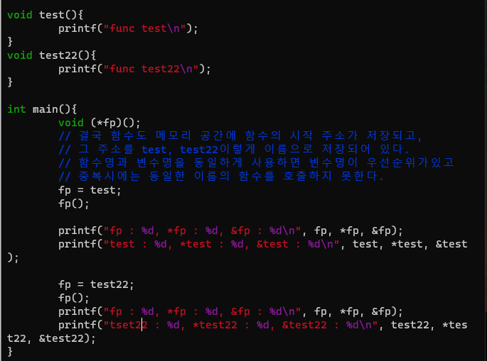 즉 함수형 포인터 안에, 이미 선언되어있는 test함수의 시작 주소가 저장되었고