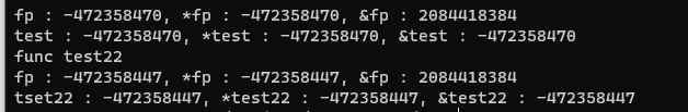 fp포인터 자체의 메모리 주소는 2084418384가 나온것을 확인 할 수있다.(배열과 동일하게 함수의 값과 포인터 값을 동일 test, *test값이 동일했다.)
