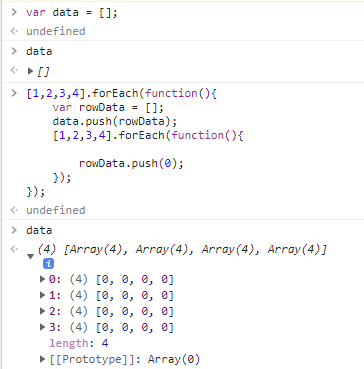 data = [ [0, 0, 0, 0] ]; 이 되고 4번이 진행된후에다시 밖쪽 forEach문의