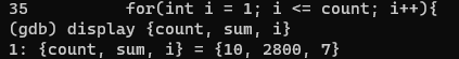 display : 보고싶은 변수를 게속 따라다니면서 볼수있으며 사용법은 p와 동일하다, display가 끝나는 시점은 해당 변수를 사용하는 함수가 끝날시에 사라진다. 해당 변수를 지우고 싶은떄는 delete display [변수명] 을사용하면된다.