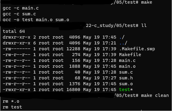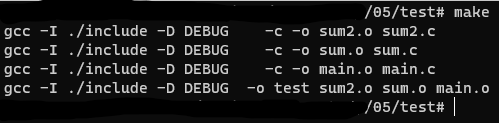 make를 진행하면 자동으로 sum2.c 가 포함되어 sum2.o sum.o main.o 로 컴파일된것이 확인되어진다.