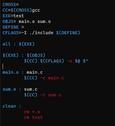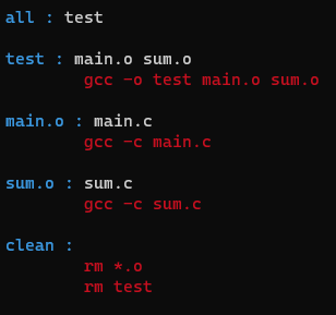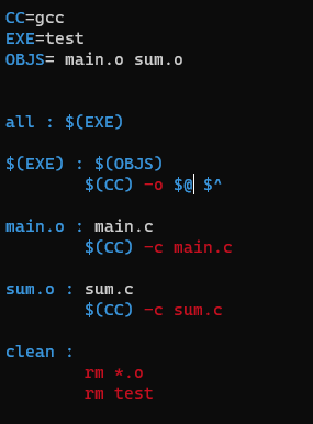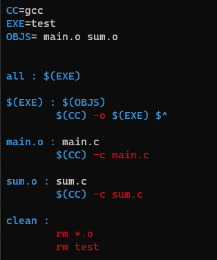 다음줄 : test : main.o sum.o --> test 라는 실행파일을 만들기 위해서는 main.o, sum.o 파일이 필요하다는 의미