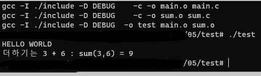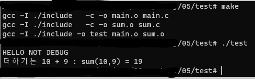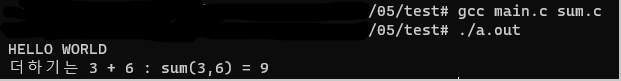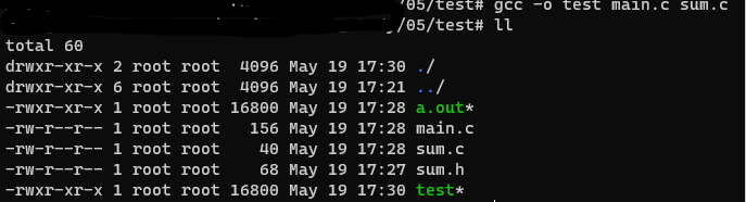 gcc -o test main.c sum.c 이를 통해 test라는 실행파일이 생성되었다.