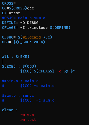 또한 와일드 카드로 사용되어 C_SRC= $(wildcard *.c), OBJ= $(C_SRC:.c=.o)