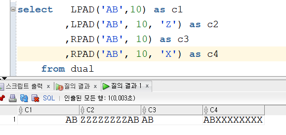 5) L(R)PAD( 문자, 숫자, [반복 문자]) : [반복문자] 는 선택이며, 문자의 왼쪽방향으로 숫자만큼의 공간을 만들고 [반복문자]를 생성한 공간만큼 반복한다.