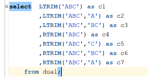 6) [ L(R) ]TRIM(char, [set]) : 왼쪽 또는 오른쪽에서 부터 char의 문자열중 set의 단어를 제거한다. set에 포함되지 않은 문자를 만나면 종료된다. set 의 DEFAULT 값은 ''(공백) 이다.