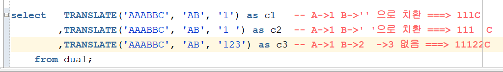 9) TRANSLATE( char, from_String, to_String) : char와 일치하는 from_String문자를 대응하는 위치의 to_String문자로 변환한다. from_String 문자와 일치하지 않는 문자는 변환하지 않는다.