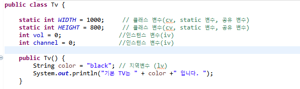 | 지역변수(lv) | 클래스 영역 이외의 영역 (메서드, 생성자, 초기화 블럭 내부) |