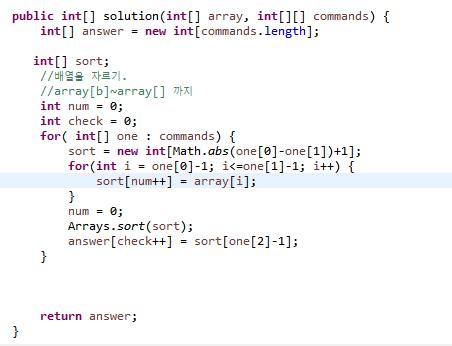 6.sort[] 의경우 commands의 시작~끝 까지의 숫자의 차보다 +1 만큼의 크기로 향상된 for문 안에서 선언하여 one[] 의 요소가 달라질떄마다 다른 크기의 배열이 생성되도록 하였다.
